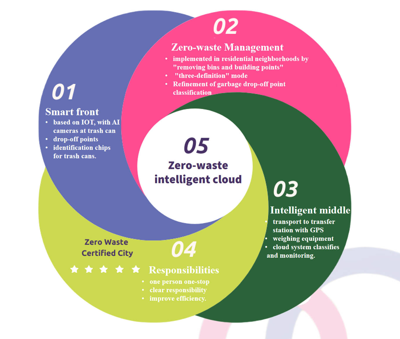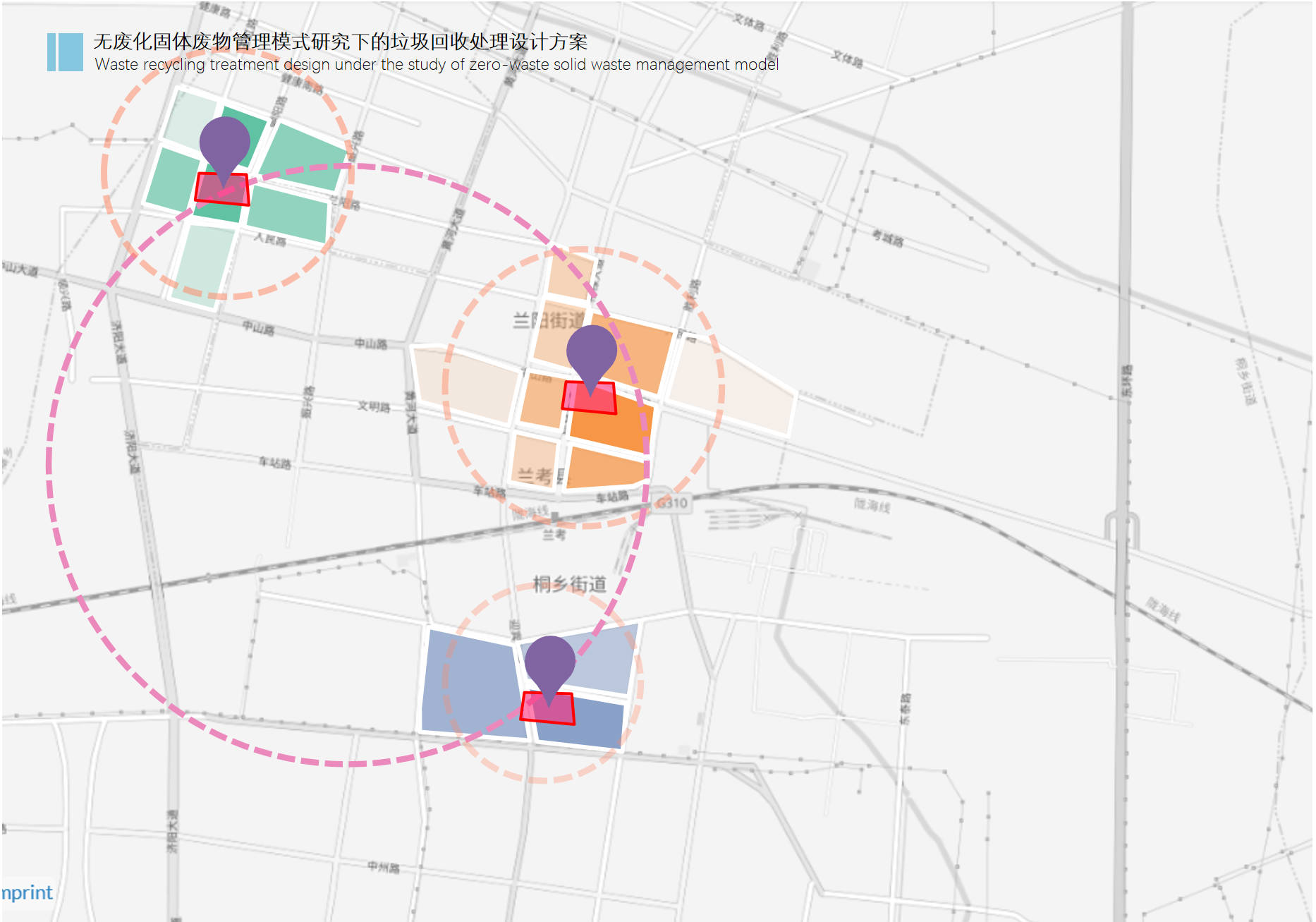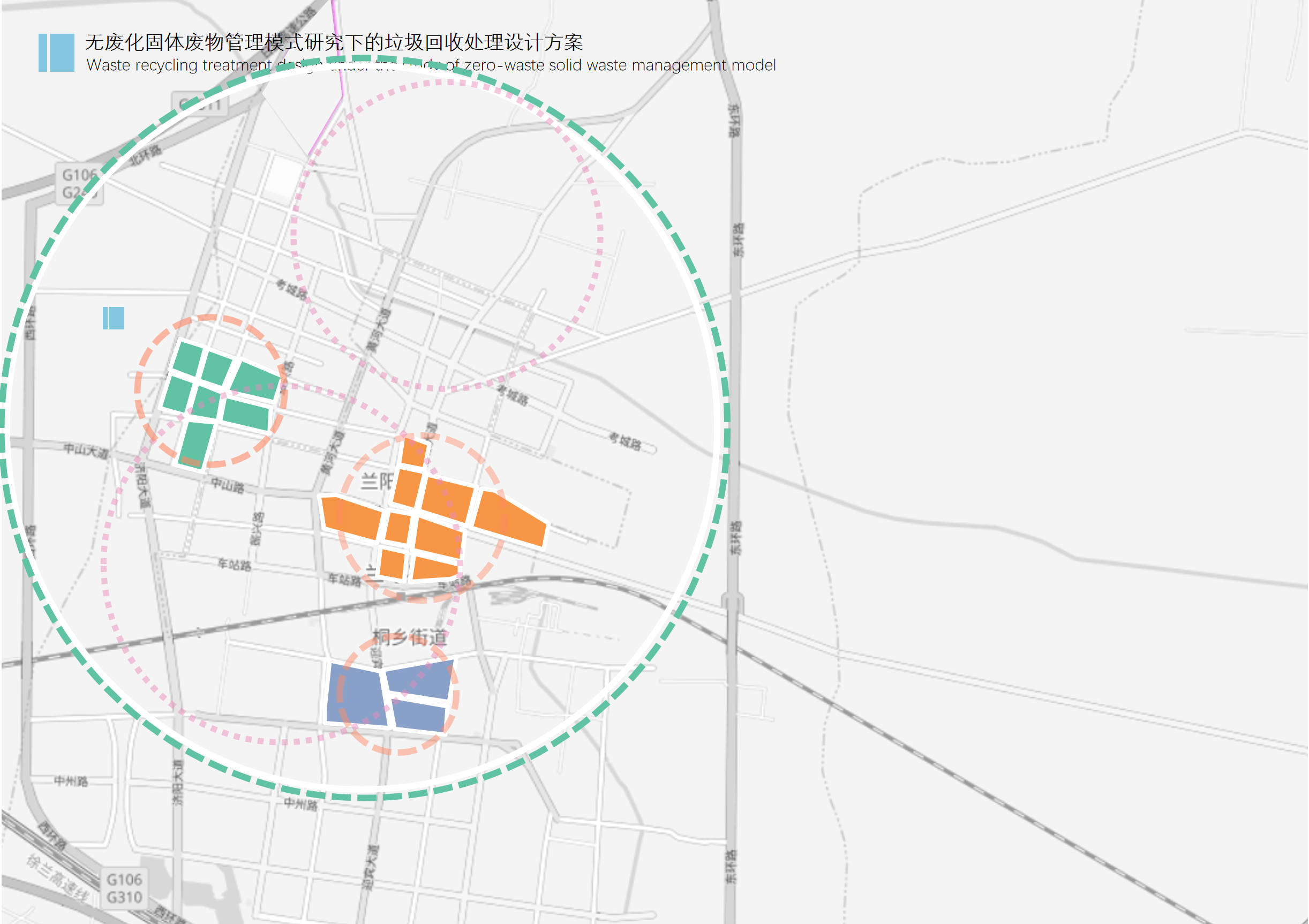The city LanKao is covered by concentric circles with a radius of ≤3km, and a community waste transfer station is set up at the center of the circle, and the garbage in the smart garbage rooms of the districts covered by the concentric circles is transported to the corresponding transfer station for sorting and recycling.