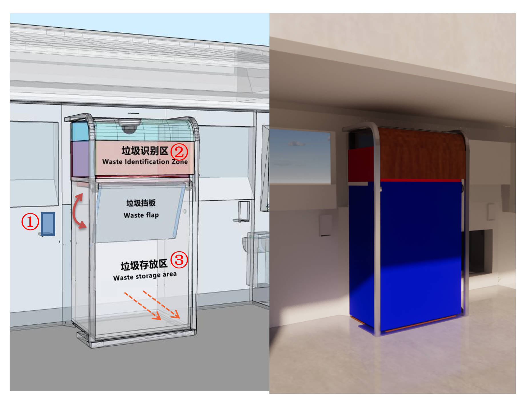- ( Step3 ) — Scanning by the camera, such as scanning and identifying more than 70% of the garbage as qualified, the baffle plate opens/falls down, and the garbage falls into the storage area ③, and the residents are qualified to put in the garbage. If it is lower than 70%, it will still fall into the bucket, but the system will record the input user as unqualified input behavior. (Step 4: The staff withdraws the garbage cans from ③ and replaces them with the garbage cans that have been washed at the transfer station.