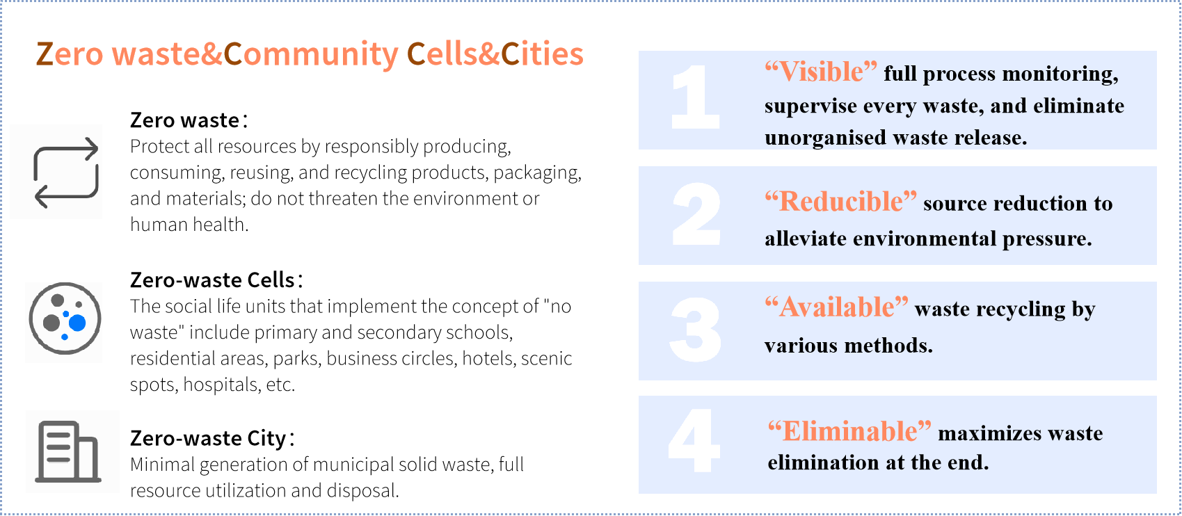 The “zero waste concept” developed in the United States in the 1970s. A trash disposal company was processing electronic chemicals to increase the reuse rate of things and raw materials while avoiding waste formation, which would result in the waste of a significant quantity of land resources. After being proposed, the concept was initially used in the urban environmental management of Australia’s capital, Canberra. Canberra was also the first to establish the objective of creating a “zero waste city” based on the “zero waste” concept. (Zhang, 2021).