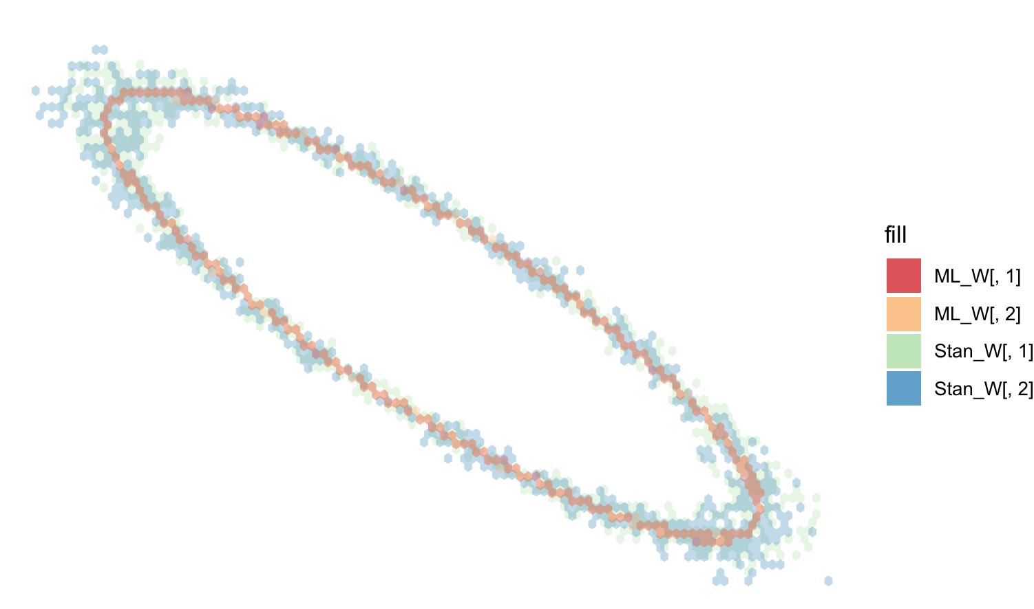 geom_hex(aes(W11, W21, fill = 'Stan_W[, 1]'), alpha = 0.3, bins = 100) +