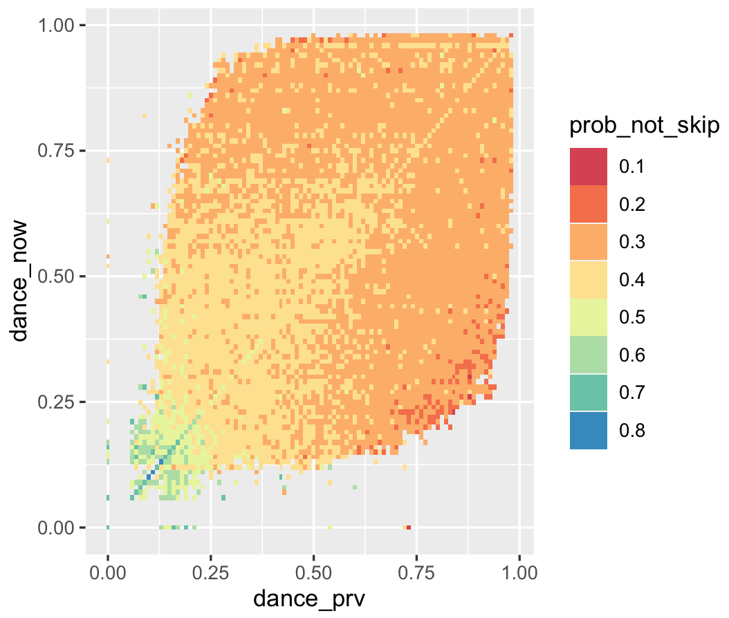 x = ~dance_prv, y = ~dance_now, z = ~log(prob_not_skip),