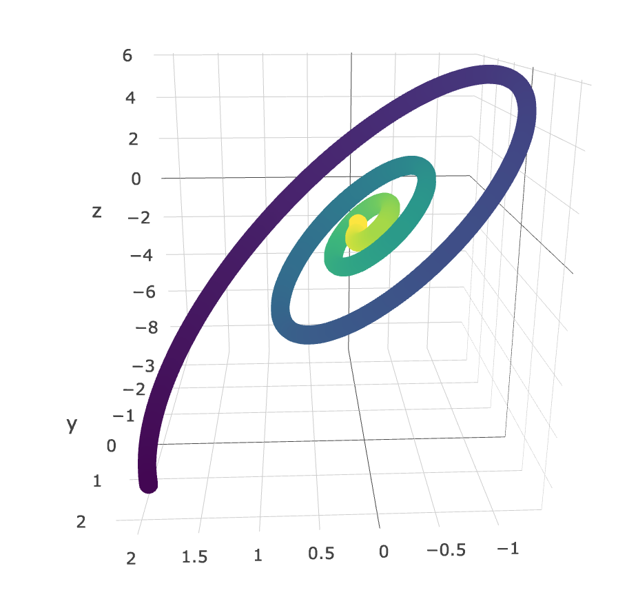 Graphs of \((X(t), Y(t))\) can be quite uninterpretable, although there are times where these are super helpful. Below is an example of a plot I made (using plotly, colored by time) with the LANL data (I can’t remember what the rv.s were, but it was something like \((X, \frac{\Delta X}{\Delta t}, \frac{\Delta^2 X}{\Delta t^2}\)). You can clearly see a very interesting relationship - one that may be well described by the dynamical equations of this process.