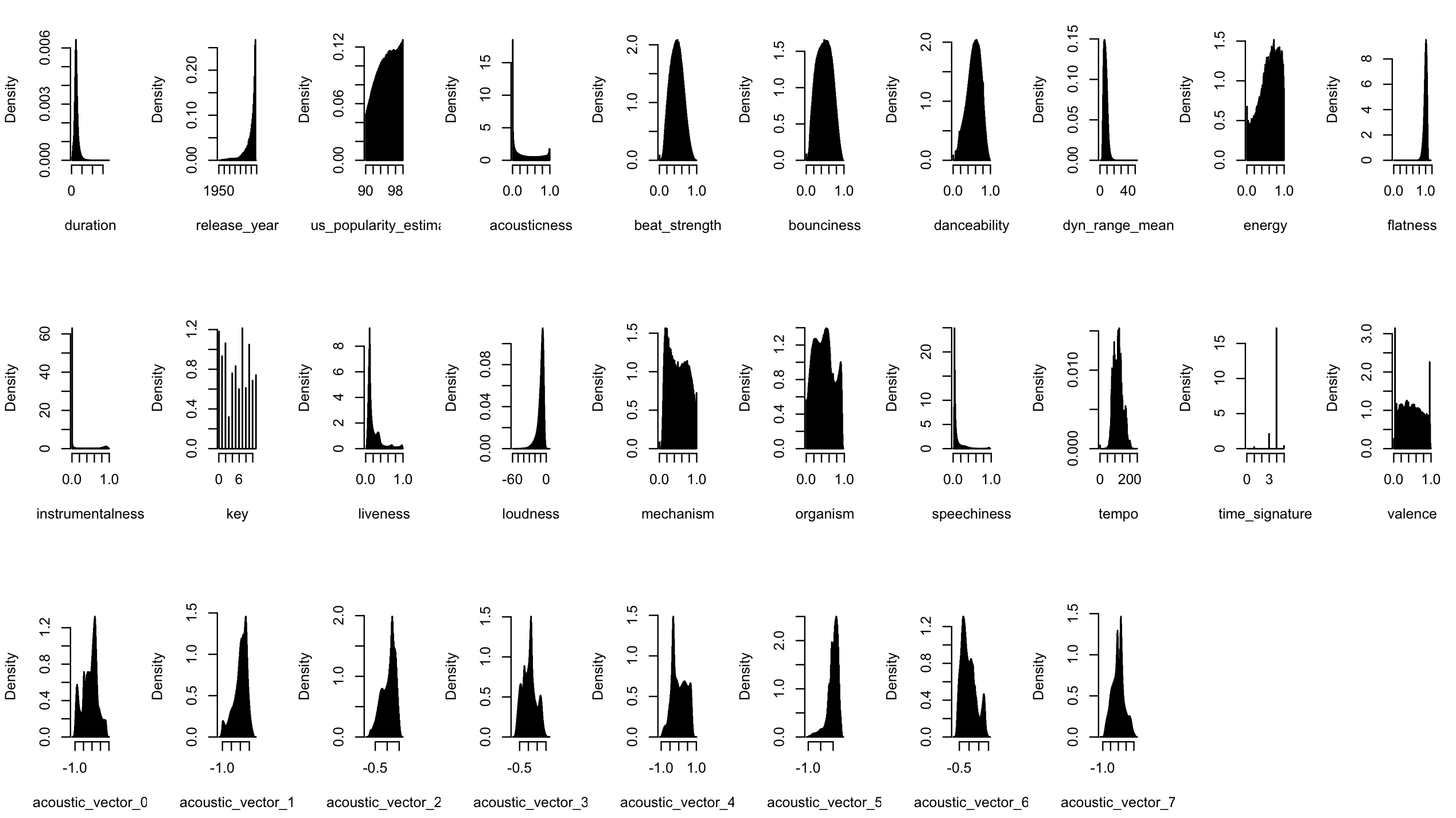 dataframe contains an id, duration, release year, popularity estimate, auditory features (e.g. acousticness, danceability) and some kind of latent representation (acoustic_vector). All these are numeric.