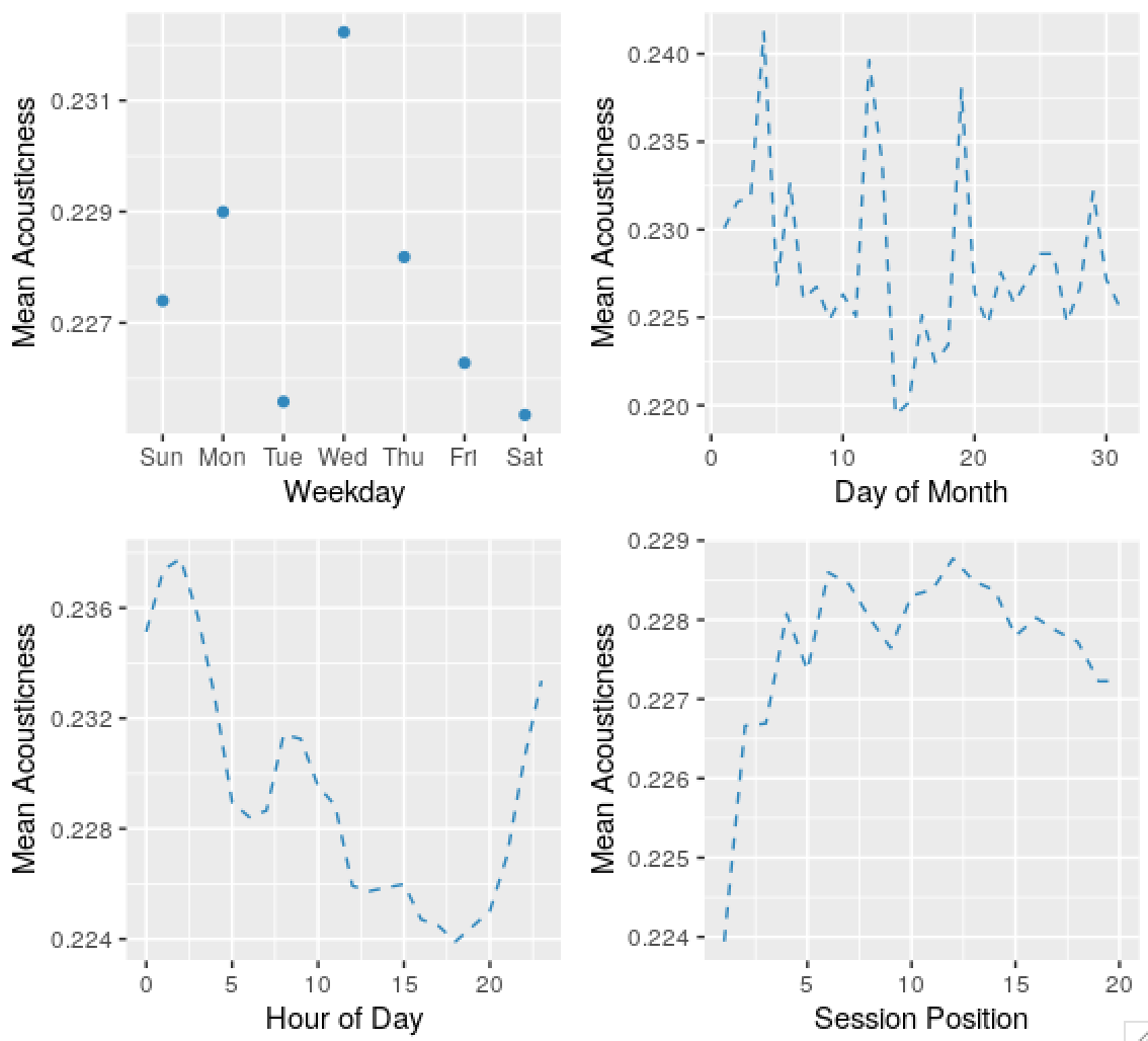 Predictably, there’s seasonality in the skip series, and the acousticness of tracks played, and other variables. Some dates are weird and obviously wrong, I’ll ignore these in the future. The autocorrelation in the probability of skips by day of month series might be an apparent effect due to weekday and time of day effects.