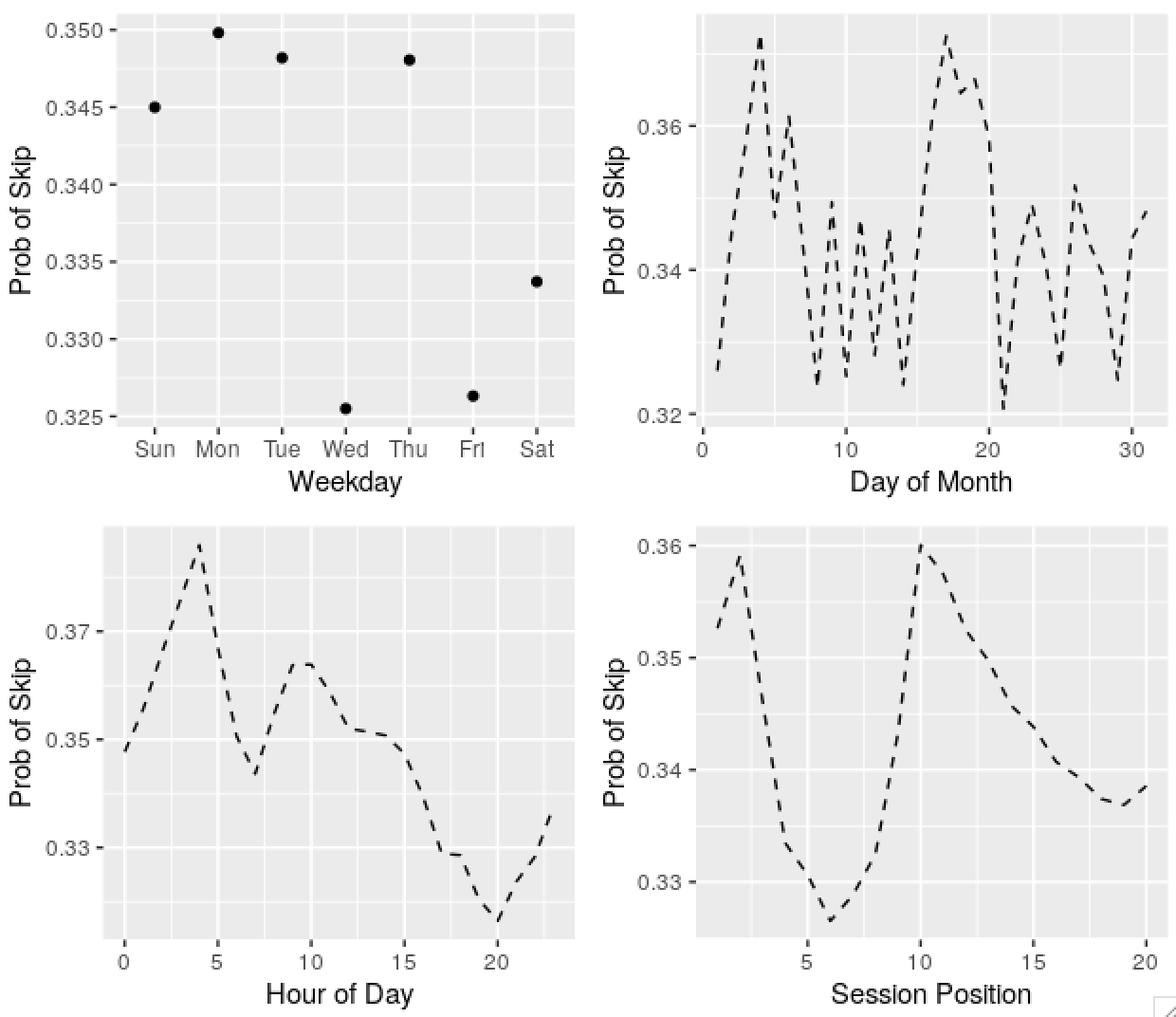labs(x = 'Hour of Day', y = 'Prob of Skip')