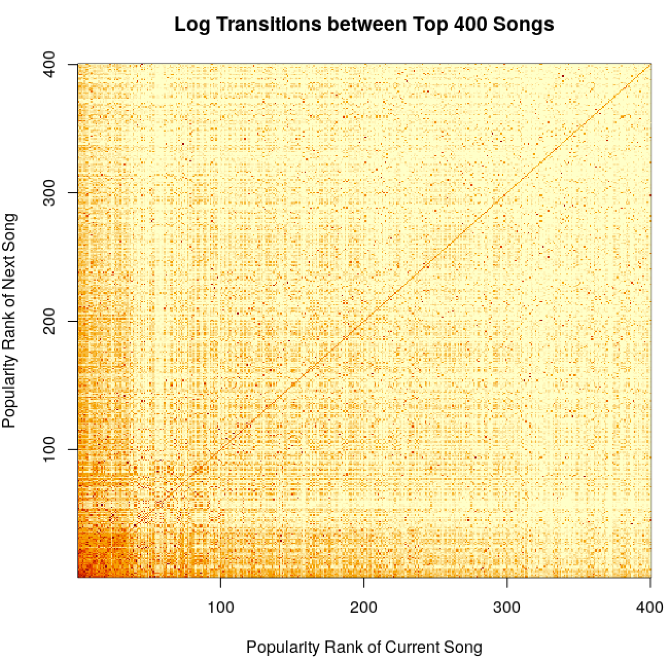 image(x = 1:num_songs, y = 1:num_songs, log(trans_mat[1:num_songs, 1:num_songs] + 1),