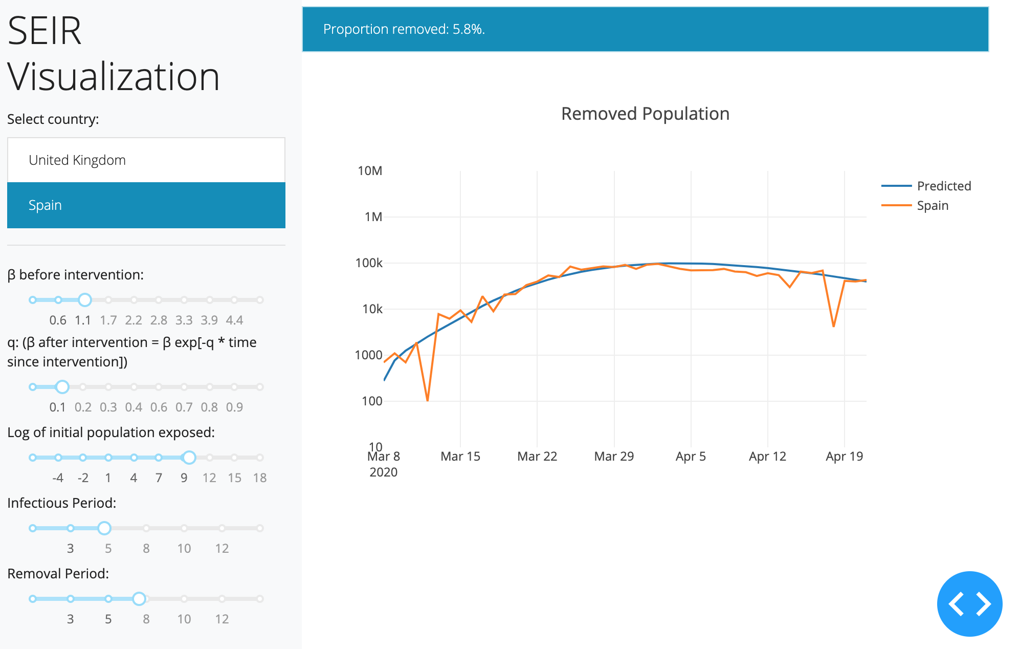 html.Label('q: (β after intervention = β exp[-q * time since intervention])'),